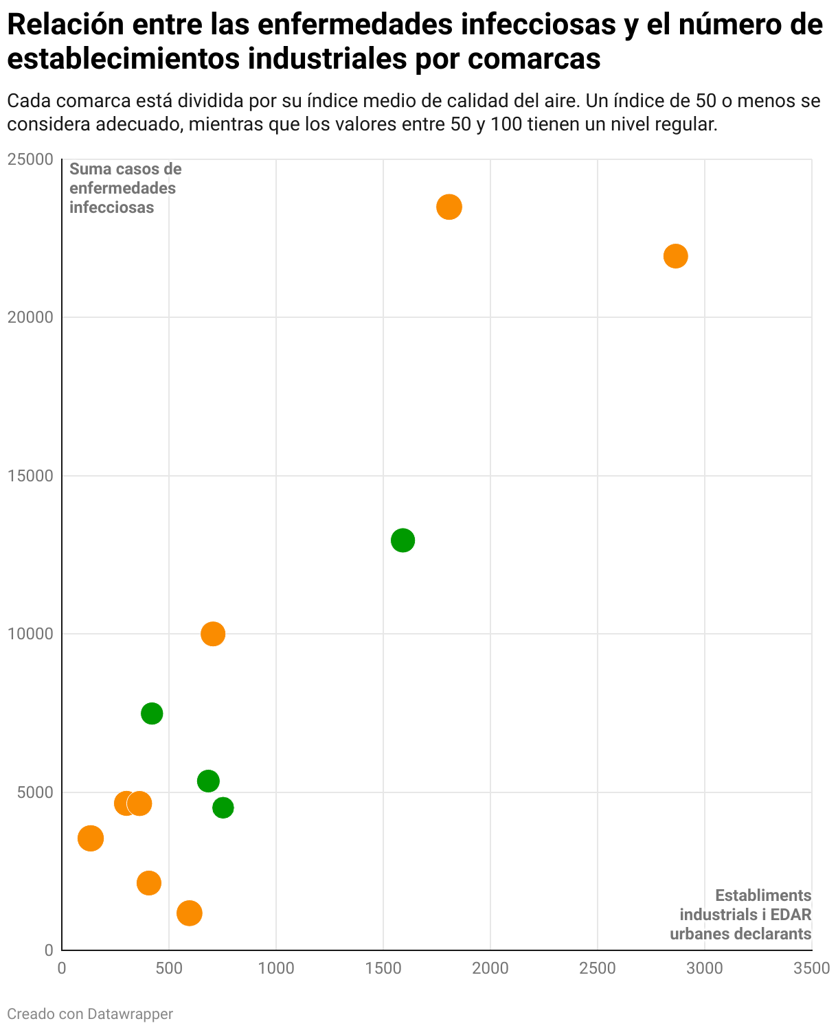 Hemos realizado un análisis a partir de las bases de datos del índice de calidad del aire (IQCA), las enfermedades de declaración obligatoria numérica y la cantidad de residuos industriales recopilada por Idescat. Una vez teníamos los datos hemos creado una tabla de excel para centrarnos en las comarcas, por lo tanto, hemos agrupado las poblaciones por comarcas y calculado el valor medio de la calidad del aire de cada una. A partir de aquí, agrupar los datos de enfermedades y residuos industriales ha sido más sencillo y claro para encontrar correlación entre los datos. Con el análisis realizado hemos pasado los resultados a la web Datawrapper para poder visualizar el contenido en la noticia. Finalmente, hemos recopilado las conclusiones y las hemos ordenado para proporcionar un orden y una explicación coherente en nuestra práctica.